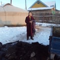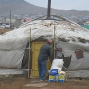 Verteilung von Kleidung, Decken, Schuhen, Mehl, Zahnbürsten, Spielsachen, einem grossen Sack Mehl etc. im Bezirk Charat, Ulanbaatar an 10 ärmste Familien. Eine Sozialarbeiterin des Bezirkes fährt mit uns zu den ärmsten Familien. Wir, das bin ich, Sandra Neitzke, die Vorsitzende des Vereins und die mongolischen Mitarbeiter Nyamaa und Askar. Der Tag ist kalt und regnerisch.